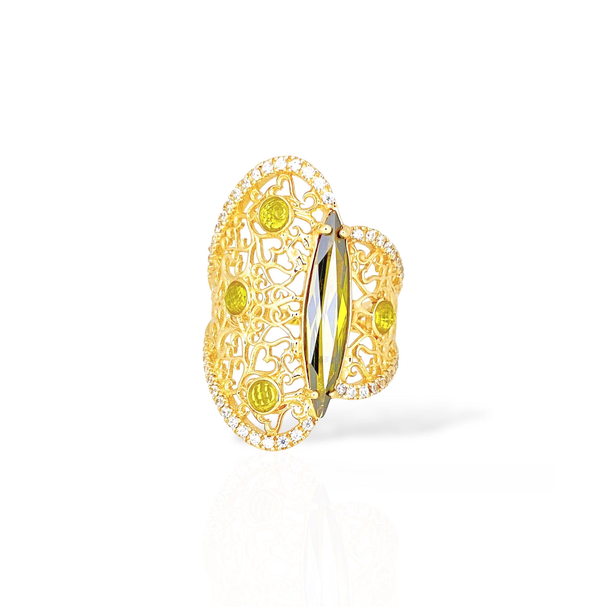 טבעת זהב 14K תחרה מיוחדת משובצת אבנים ירוקים וזירקונים